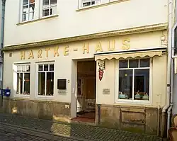 Das zweigeschossige, verputzte Giebelhaus mit einem Satteldach wurde im 17./18. Jahrhundert in der Epoche des Barocks gebaut. Von 1959 bis 1961 fand ein Wiederaufbau nach Plänen von Traugott Kühne statt. In dem Haus befand sich die Großbäckers Hartke des Bäckermeisters Christian Hartke.