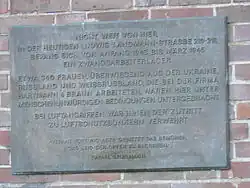 Während des Zweiten Weltkrieges war Hartmann & Braun ein kriegswichtiger Betrieb. 1941/42 entstand ein neues Werk in Praunheim, das rund 1.000 Mitarbeiter beschäftigte. Das Stammwerk von Hartmann & Braun zwischen Gräfstraße, Falkstraße und Leipziger Straße in Bockenheim wurde bei einem Luftangriff am 8. Februar 1944 weitgehend zerstört, wobei 165 Arbeiter ums Leben kamen.[1] Das neue Werk Praunheim blieb von den Kriegseinwirkungen weitgehend verschont, wurde aber bei Kriegsende zeitweise von der amerikanischen Armee beschlagnahmt. In diesem Werk waren von Anfang 1943 bis März 1945 etwa 340 Frauen, vorwiegend aus der Ukraine, aus Russland und Weißrussland, als Zwangsarbeiterinnen eingesetzt. An das Lager in der Ludwig-Landmann-Straße erinnert eine 1995 angebrachte Gedenktafel.
