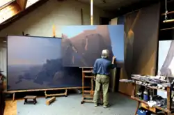 Seine Arbeitsweise war den Umständen angepasst. Meist konnte er seine Eindrücke nur in schnellen Skizzen festhalten. Vor allem in den frühen Morgenstunden und am Abend, wenn Licht und Schatten starke Kontraste erzeugen, zeichnete und fotografierte er. Im Höchstädter Atelier entstanden seine großformatigen Landschaftsgemälde, die keine fotorealistischen Abbildungen darstellen. Ausgehend von optischen Eindrücken entwickelte er eine ganz eigene Bildsprache. Nur wenige Farben benötigte er zur Gestaltung: Rotbraun, Ultramarinblau und andere Blautöne, Ocker, Weiß und Schwarz. Dagegen fehlen Gelb, Grün und Rot fast ganz.[3] Bei genauer Betrachtung sieht man allerdings einen immensen Nuancenreichtum in den farblichen Abstufungen. Auf die weiß grundierte Leinwand skizzierte er die großen Kompositionen (ca. 300 × 180 cm) zunächst mit neutralen Farben und breitem Pinsel.[4] Je weiter die Arbeit fortschritt, desto pastoser wurde der Farbauftrag und desto feiner die Pinsel, bis er zuletzt die Farbe mit der Pinselspitze auftupfte. Besonders die späten Saharabilder geben das Diesige der sanderfüllten Luft und das diffuse Licht der Sonne wieder. Abstraktion und Reduktion des Motivs führten zu Bildgestaltungen, die das Wesenhafte der Wüste, so wie er es empfand, zum Ausdruck bringen. Dazu gehören die Weite des Raumes und geradezu spürbare absolute Stille. An einem Bild arbeitete er etwa ein halbes Jahr.[5] 80 großformatige Gemälde zu Themen aus der Sahara entstanden bis zu seinem Tod 2018.