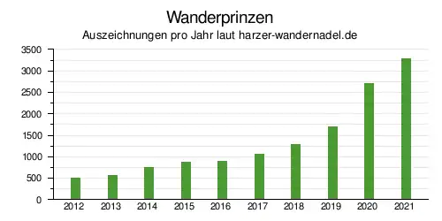 Das System erfreut sich außerordentlich großer Beliebtheit, und die Nachfrage steigt weiterhin an.[15] Allein im Jahre 2006 wurden etwa 10.000 Wanderpässe verkauft.[16] Im Jahr 2015 wurden fast 20.000 Wanderpässe neu ausgegeben.[17] Die Anzahl der jährlich verkauften Wanderpässe stieg bis 2019 auf 50.000 und hat 2020 die Anzahl 90.000 erreicht.[18][19] Bemerkenswert ist auch, dass es in jedem Jahr bis 2019 eine dreistellige, seit 2020 eine vierstellige Zahl an Wanderern gibt, die sich den „Harzer Wanderkaiser“ erwandern. Im Jahr 2022 wurde die 9000. Wanderkaiser-Auszeichnung seit der Einführung der Wandernadel vergeben.[20] Da die Stempelstellen auf eine etwa 2500 Quadratkilometer große Fläche verteilt sind,[21] sind zum Erwerb dieses Titels umfangreiche Wanderungen erforderlich.