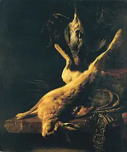 Das Jagdrecht war im Mittelalter bis in die späte Neuzeit Privileg der herrschenden Schichten, das mit Nachdruck verteidigt wurde. Jagdstillleben, oft in Gesellschaft mit exquisitem Jagdgerät, schmücken Räume barocker Schlösser und weisen auf Rang und Prestige des Besitzers hin. Das Bild von Jan Weenix zeigt ein Stillleben in der Art einer Trophäensammlung, hier von Vogel- und Niederwild, von kostbaren Früchten, Schoßhund und Schoßäffchen, die um eine antikisierende Gartenplastik mit der Figur des Herkules effektvoll arrangiert sind, das Ganze vor dem Hintergrund einer opulenten Schlossanlage. Hier werden Reichtum und luxuriöser Lebensstil des Auftraggebers oder Besitzers des Bildes demonstriert.