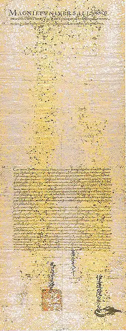 - ↑ Quo tandem cum anno Salutis 1615. iuvante deo pervenissemus, à SS. Papa magno cum Cardinalium Sacri Collegij Antistitum ac Nobilium concursu, nec non & Rom. populi ingenti lætitia & communi alacritate non modo benignè excepti, verùm & humanissimè tam nos quam etiã tres alij, quos Iaponii Christiani, quatenus eorum circa Christianam Religionem statum Apostolicis auribus intimarent, specialiter destinaverant, auditi, recreati, & prout optabamus, quantocyus expediti. (S. 1. (Seite nicht mehr abrufbar, festgestellt im April 2018. Suche in Webarchiven) Info: Der Link wurde automatisch als defekt markiert. Bitte prüfe den Link gemäß Anleitung und entferne dann diesen Hinweis.)