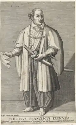 - ↑ Collega alter legatus Philippus Fiaxecura [sic] postquam ad prædictum Regem suum pervenit, ab ipso valdè est honoratus, & in proprium statum missus, ut tam longâ viâ fessus reficeretur, ubi uxorem, filios, domesticos cum multis aliis vasallis Christianos effecit, aliisque nobilibus hominibus consanguineis & propinquis suasit ut fidem reciperent; quam utique receperunt. Dum in his & aliis piis operibus exerceretur ante annum completum post eius regressum magna cum omnium ædificatione & exemplo, multa cum præparatione suis filiis hæreditate præcipua fidei propagationem in suo statu, & Religiosorum in eo regno pretectionem commendatam relinquens, pie defunctus est. De cuius discessu Rex & omnes Nobiles valdè doluerunt, præcipuè tamen Christiani & Religiosi, qui huius viri virtutem & fidei Zelum optimè noverant. Ab ipsis Religiosis, qui eidem sacramenta ministrarunt, eiusque obitui interfuerant; & ab aliis sic per literas accepi. (S. 16. (Seite nicht mehr abrufbar, festgestellt im April 2018. Suche in Webarchiven) Info: Der Link wurde automatisch als defekt markiert. Bitte prüfe den Link gemäß Anleitung und entferne dann diesen Hinweis.)