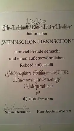 - ↑ „Allein 1975 haben Hauff/Henkler beachtliche internationale Erfolgsbeweise nach Hause gebracht: den 1. Preis in der Publikumswertung vom Schlagerfestival in Ljubljana, gemeinsam mit Frank Schöbel und Aurora Lacasa den Sonderpreis vom „Coup d'Europe Musicale“ in Österreich und als Krönung den „Grand Prix de la chanson de Paris“, eine Trophäe, um die sich 30 Länder beworben hatten.“ Neue Berliner Illustrierte, Ausgaben 27–53, 1975, S. 30, auf Google Books („H & H in Golzow“); Chronik der DDR 1975, abgerufen am 8. Februar 2015