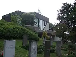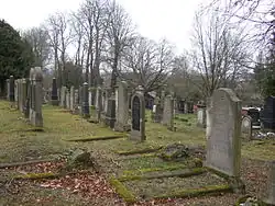 1871 | Gegenüber der Friedhofskapelle, die nach dem Zweiten Weltkrieg wieder aufgebaut wurde, sind etwa 1600 Bombenopfer begraben. |