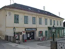 Der zweigeschoßige Hauptbau der ehemaligen Hofanlage geht im Kern auf das 17. Jahrhundert zurück und erhielt sein heutiges Aussehen mit der kräftigen Übergiebelung im Mittelbereich in der ersten Hälfte des 20. Jahrhunderts. Bis zu diesem Zeitpunkt hatte der Bau eine glatte Fassade mit Steingewändefenstern und ein vorgelagertes kastenförmiges Geschäftsportal aus dem späten 19. Jahrhundert.[15]