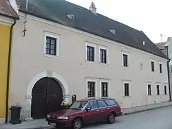 Im Keller des Gebäudes sind Reste eines Renaissanceportals mit volutenförmigem Schlussstein erhalten, wie sie im letzten Drittel des 16. Jahrhunderts üblich waren. Im Kern stammt das heutige Wohnhaus zumindest aus dieser Zeit[14] und der ganze Gebäudekomplex entspricht sowohl in der Anlage als auch in der Funktion noch den mittelalterlichen Gegebenheiten: An der dem Hauptplatz zugekehrten Schmalseite des Grundstückes steht das Wohnhaus, gefolgt von den hofseitig angeordneten Wirtschaftsgebäuden. Die Scheune am ehemaligen Hintausweg, der heutigen Ziersdorferstraße, wurde durch eine für landwirtschaftliche Fahrzeuge genutzte Halle ersetzt.