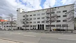 Die asymmetrische, verschieden hohe Baugruppe ist gegenüber der Hindenburgstraße zurückgesetzt und hat eine leicht gekrümmte Straßenfassade. Sie besteht aus dem viergeschossigen Hauptgebäude (plus Dach- und Kellergeschoss) mit einem abgewalmten Flachdach, nordöstlich gefolgt von dem sechsgeschossigen, schmalen Treppenhausturm mit Aufzug und zwei Uhren und einem zweigeschossigen Seitenflügel, dessen Flachdach teilweise als begehbare Dachterrasse ausgebildet ist. Die Rückseite wird hinter dem Hauptgebäude von dem 1988 gebauten zweigeschossigen Verteilungsgebäude geprägt.