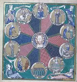 Psalter der Blanka von Kastilien[3] | um 1230 | Frankreich: Paris | Ludwig und Blanka von Kastilien | lateinischer Psalter; 27 Miniaturen und 24 Medaillons | Paris, Bibliothèque de l’Arsenal, Ms. lat. 1186 | |