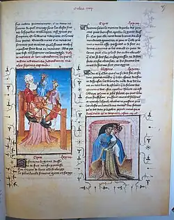 Bibel des Jean de Vaudetar[19] | 1372 | Frankreich: Paris | Jean de Bondol | Karl V. | Jean de Vaudetar: Bible historiale; 269 Illustrationen | Den Haag, Museum Meermanno-Vesteenianum, Ms 10 B 23 |