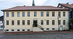 Das zweigeschossige elfachsige verputzte spätklassizistische Gebäude mit Sockelgeschoss und flachem Walmdach wurde 1856 als Privatschule gebaut. Bemerkenswert ist ein denkmalgeschütztes Gewölbe. In dem besonders ortsbildprägenden Gebäude war danach jahrzehntelang eine Bäckerei mit dem Café Bavendamm sowie Wohnungen. Von 1998 bis 2009 stand das Haus leer.