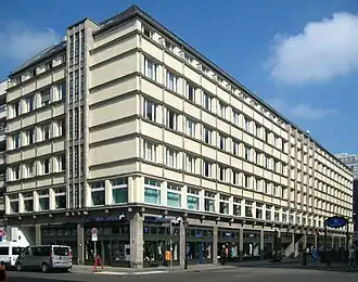 Hervorgehoben wird ein vierachsiger Mitteltrakt an der Friedrichstraße, wo die Vorlagen kräftiger sind und sich durchgehend bis zum Attikageschoss erheben. Die gegenüber den Geschäftsräumen im Erdgeschoss leicht vorkragenden Büroetagen ruhen auf Konsolen. Die Reihe breiter Fenster des ersten Obergeschosses ist durchlaufend, die Fensterreihen der folgenden Stockwerke werden am Eckbereich der Seitenfassaden unterbrochen. Einen Gegensatz zum modernen Erscheinungsbild des Gebäudes erzeugt das traditionelle Walmdach, das aufgrund des zurücktretenden Attikageschosses von den umliegenden Straßen her jedoch kaum sichtbar ist.