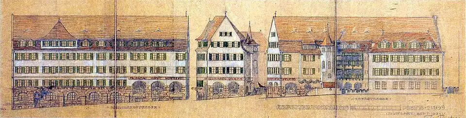 Der Verein für das Wohl der arbeitenden Klassen unter Eduard Pfeiffer erteilte Theodor Fischer 1904 den Auftrag, auf dem spitzwinkligen Grundstück zwischen Wilhelmsplatz, Leonhardstraße und Weberstraße ein Arbeiterwohnhaus und Geschäftshaus zu errichten. Im Frühjahr 1906 war das Gebäude bezugsfertig. Im Erdgeschoss wurden 2 Läden, 1 Werkstatt und 1 Lokal untergebracht, in den oberen Geschossen 10 Wohnungen mit 3 und 12 Wohnungen mit 2 Zimmern.[2] Das 2008 sanierte Haus Leonhardstraße 13 steht unter Denkmalschutz, die Gebäude an der Leonhardstraße 11 und der Weberstraße 9 dagegen nicht.