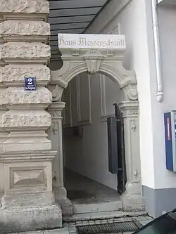 Haupteingang mit Namenstafel über dem Eingang