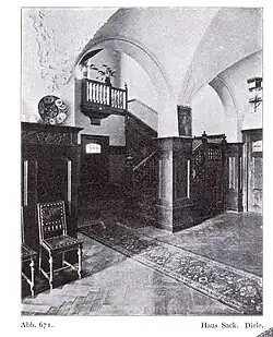 Das zweigeschossige Wohnhaus bildete „mit den Nebengebäuden einen geschlossenen Herrschaftssitz“. Im Erdgeschoss befanden sich die Wohn- und Wirtschaftsräume. Die Wirtschaftsräume waren geräumig und standen in unmittelbarem Zusammenhang mit der Nebentreppe. An die Anrichte schloss sich der Speisesaal an. Dem Saal schlossen sich Salon und Herrenzimmer an. Wohn- und Empfangszimmer waren mit dem Speisesaal durch eine Halle verbunden. Im Obergeschoss befanden sich Schlaf- und Kinderzimmer. Das Gebäude wurde später umgebaut.