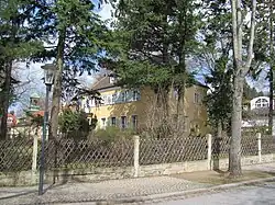 Garten von Haus Schädler, davor die Nymphe als Bilzdenkmal auf dem Eduard-Bilz-Platz