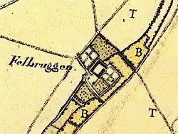 1262 erscheinen die Brüder Arnold und Gerhard von Vol(l)merincheim als Zeugen in einer Urkunde. Der Name Vol(l)merincheim entwickelte sich im Laufe der Zeit zu Velmercken und dann zu Vellbrüggen. Die Forschung geht deshalb mehrheitlich davon aus, dass es schon im 13. Jahrhundert am Ort des heutigen Hauses eine wasserumwehrte Vorgängeranlage gegeben hat.[4] Diese gelangte im 14. Jahrhundert in den Besitz der Herren von Aldenbrüggen, die sich nachfolgend zusätzlich Velmercken nannten und die Burg zu ihrem Stammsitz machten.[5][6][7] Anfang des 15. Jahrhunderts waren die beiden Namen dann zu Vellbrüggen verschmolzen.[8]