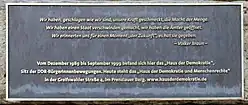 Nach einem seit Mitte der 1990er Jahre andauernden Streit über die ungeklärten Eigentumsverhältnisse an der Immobilie und nach der Entscheidung der Parteivermögenskommission gegen die Nutzung des Hauses durch die politischen Bewegungen erfolgte im Herbst 1999 der Umzug in das doppelt so große, aber etwas weniger zentral gelegene Gebäude in der Greifswalder Straße 4. Im Kontext des Umzugs und dem Hinzukommen von Amnesty International als größten Mieter, wurde der Name des Haus der Demokratie in Haus der Demokratie und Menschenrechte geändert.[2] Während die Bundeszentrale von Amnesty International mittlerweile eine neue Adresse hat,[3] ist die Amnesty International Sektion des Bezirks Berlin-Brandenburg sowie das Regionalbüro Ost weiterhin im Haus der Demokratie beheimatet.[4]