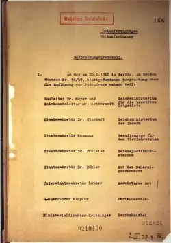 Das von Eichmann nach einer Stenografie erstellte Besprechungsprotokoll wurde von Müller und Heydrich mehrfach überarbeitet. Von der Endfassung wurden insgesamt 30 Exemplare ausgestellt, die als „Geheime Reichssache“ gestempelt und dann an die Teilnehmer bzw. ihre Dienststellen versandt wurden.[51] Davon wurde bis heute nur das 16. Exemplar, das des Konferenzteilnehmers Martin Luther, aufgefunden. Offenbar entging es nur deshalb der Aktenvernichtung, weil Luther wegen einer Intrige gegen Außenminister Joachim von Ribbentrop im KZ Sachsenhausen inhaftiert worden war, weshalb seine Abteilung aufgelöst und die Akten ausgelagert worden waren.[52] Teile des Archivs wurden von US-Amerikanern zunächst ins Marburger Schloss geschafft, im Februar 1946 im Telefunken-Werk in Berlin-Lichterfelde weiter gesichtet und dabei auch die Wannsee-Dokumente erstmals mikroverfilmt.[53] Im Sommer 1948 wurde der gesamte Bestand nach Whaddon Hall / Buckinghamshire in Sicherheit gebracht, dort erneut verfilmt und Ende der 1950er-Jahre an das Politische Archiv des Auswärtigen Amtes in Bonn zurückgegeben;[54] das Dokument befindet sich seit dem Umzug des Politischen Archivs nunmehr in Berlin.[55] Es ist im Internet barrierefrei verfügbar.[56]