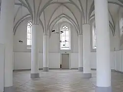 Im Inneren tragen drei runde Säulenpaare das Kreuzgewölbe, das an den Schrägen des Chores als Kappengewölbe ausgebildet ist. Die Gewölberippen bestehen aus Stuck, haben also keine konstruktive Funktion, die Schlusssteine sind schmucklos.
