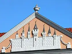 Die im Giebelfeld dargestellten Sieben Türme stehen nicht in Braunschweig, sondern stellen das „Gefängnis der sieben Türme“ in Konstantinopel dar. Die barocke Darstellung bedient sich hier der Allegorie der Halbmonde, obwohl Konstantinopel zur Zeit des zugrundeliegenden Geschehens noch nicht muslimisch war. Einer der vielen Sagen um Heinrich den Löwen zufolge soll ein dem Namen nach unbekannter Gefährte Heinrichs des Löwen auf der Pilgerfahrt 1172 ins Heilige Land in Konstantinopel im „Gefängnis der sieben Türme“ eingesessen haben. „Wenn ich je wieder herauskomme, baue ich ein Haus mit sieben Türmen,“ so lautete sein Gelöbnis.