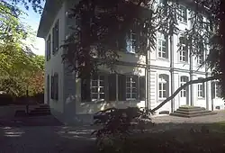 Das Haus liegt zurückversetzt in einem Garten. Der dreiachsige Pavillon wurde beim Umbau als Teil des Mittelrisalits in das siebenachsige, dreistöckige Wohnhaus integriert. Dabei behielt man die Stichbogenform der Fenster bei. Der Mittelrisalit ist von einem markanten Dreiecksgiebel bekrönt und durchstösst das Traufgesims des Mansarddaches. Die Pilaster sind abwechslungsreich gestaltet, da ihre Säulenordnung und Höhe in jedem Stockwerk wechselt und sie zudem mit Gurtgesimsen, Kapitellen und Sockeln gegliedert sind. Das Gitter des schmiedeeisernen Portals am Rande des Gartens stammt vom 1739 errichteten Gasthof «Löwen» an der Vorderen Vorstadt, das acht Jahrzehnte später zum Regierungsgebäude ausgebaut worden. Aus dem Jahr 1792 stammt ein Brunnen im Louis-seize-Stil.