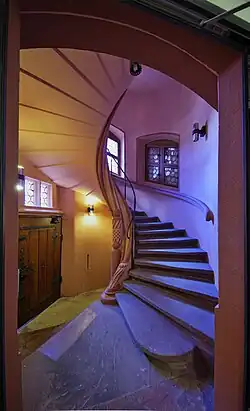 Ein Treppenturm mit einer Wendeltreppe wurde im 18. Jahrhundert abgerissen und als Ersatz eine Eichen-Treppe in die Halle eingebaut. Dabei wurden Teile des gotischen Portals vom ersten Obergeschoss zur Wendeltreppe abgeschlagen. Im Rahmen des Umbaus von 1909 bis 1911 wurde jedoch der Ursprungszustand wiederhergestellt, wobei die Wendeltreppe eine veränderte Drehrichtung erhielt und die Eichentreppe in den westlichen Flügelbau versetzt wurde.[59]