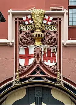 Das Portal, das von der Rückseite des Gebäudes auf den Hof führt, bekrönt ein bemaltes Relief mit Wappen und Siegel der Stadt Freiburg.[14]