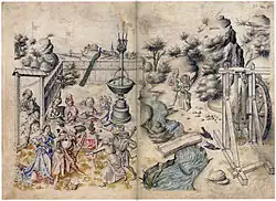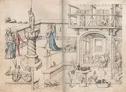 Das Mittelalterliche Hausbuch von Schloss Wolfegg ist ein um etwa 1480 von mehreren Künstlern und Schreibern vermutlich am Mittelrhein geschriebenes und illustriertes handschriftliches Kompendium zu verschiedenen Themen des für einen Adeligen und Familienvorstand nützlichen praktischen Wissens. Berühmt ist das Hausbuch jedoch vor allem für seine lebendigen Bilder, um deren Urheber unter dem Notnamen Meister des Hausbuches eine intensive Diskussion geführt wird.[1] Die figurenreichen Zeichnungen gewähren einen lebendigen Einblick in das Alltagsleben am Übergang vom Spätmittelalter und Früher Neuzeit.