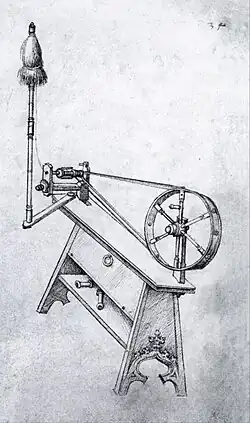 Der Rezeptteil des Hausbuches ist mit nur einer Illustration versehen, der ganzseitigen Zeichnung eines für die Entstehungszeit hochmodernen Spinnrads (fol. 34r). Das Bild gilt als erste Darstellung eines handgetriebenen Spinnrads mit Spinnflügel (und integriertem Spinnrocken), bei dem das gesponnene Garn automatisch über einen der Flügelarme mit Führungshäkchen auf die Spule aufwickelt wird. Zwei Ersatzspulen sieht man im Fach der Spinnrad-Bank liegen.