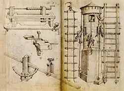 Es folgen Texte und Zeichnungen zum Bergwerk- und Hüttenwesen. Dargestellt wird unter anderem das Saigerverfahren zur Verhüttung von Erz, mehrere Arten von Blasebälgen, Pumpenwerke und Rammen. Die Zeichnungen auf den Seiten 35v und 36r gelten als die weltweit ersten Darstellungen eines Seigerhüttenwerks und fanden deshalb besondere internationale Beachtung.[19]
