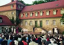 Die erste bekannte urkundliche Erwähnung von Kloster Hausen als ein durch Graf Heinrich von Henneberg gegründetes Prämonstratenserinnen-Kloster stammt aus dem Jahr 1161.[3][158][159] Graf Heinrich von Henneberg verschenkte es an das Bistum Würzburg, als er den Ort Hausen an den Würzburger Bischof Heinrich II. von Stühlingen veräußerte. Unter Fürstbischof Julius Echter von Mespelbrunn erfolgte die Umwandlung in ein Universitätsgut.