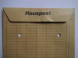 Gewöhnlich sind Hauspostumschläge etwas größer als DIN A4, also DIN B4, mit dem Namen von Behörde oder Firma und mit dem Zusatz Hauspost bedruckt. Dann sind auf Vor- und Rückseite in Spalten einheitlich große Adressfelder aufgedruckt, die mit der Hand beschriftet werden oder mit einem der meist selbst hergestellten Adressaufkleber beklebt werden können. Meist wird auf die separate Angabe des Absenders verzichtet. Er steht schließlich ja auch auf dem inliegenden Schreiben. Es gibt auch Briefumschläge mit der Aufteilung: linke Spalte Absender, rechte Spalte Adressat. Die Briefumschläge haben an der Lasche keine Gummierung, da sie meist unverschlossen versendet werden. Dass Inhalt enthalten ist, ist oft durch Lochungen bemerkbar. Soll der Inhalt ausnahmsweise verschlossen verschickt werden, kann er durch Papiersiegel verschlossen werden. Darüber hinaus ist die deutliche Aufschrift PERSÖNLICH/VERTRAULICH angeraten.