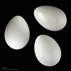 Die spitzovalen Eier sind reinweiß, nur selten zart hellblau angehaucht. Im Mittel messen sie ungefähr 20 × 15 Millimeter und wiegen etwas über zwei Gramm. Wie bei den meisten Singvögeln findet die Eiablage vorwiegend in den frühen Morgenstunden statt, jeweils mit einem Tag Abstand. Das durchschnittliche Vollgelege enthält fünf Eier. Die Gelegegröße zeigt in Europa nur geringe saisonale, geografische und höhenabhängige Variation. Am zweithäufigsten sind Vierergelege, Sechsergelege sind seltener, aber noch normal.[35]