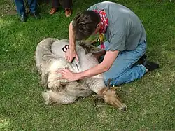 Je nach Fall kann es genügen, sich neben das Tier zu stellen, damit es sich abrollen kann oder das Schaf ,hochzuschubsen‘, damit es sich auf die Seite drehen kann, eventuell auch in mehreren Versuchen.