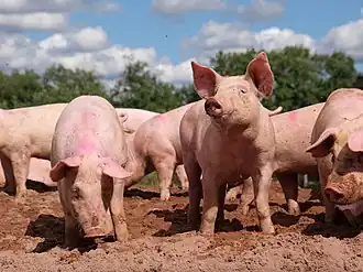 Schweine gelten eher als dreckig. Untersuchungen zeigen jedoch, dass Schweine, die in ausreichend weitläufigen Ställen gehalten werden, generell eine Ecke als Kotecke nutzen. Ihr Suhlen in feuchtem Schlamm ist eine angeborene Verhaltensweise, die der Reinigung dient, bei hohen Temperaturen ihre Körpertemperatur senkt und sie vor Sonnenbrand schützt. Schweine haben keine Schweißdrüsen.[21]