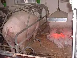 Bei Schweinen beträgt die Trächtigkeitsdauer etwa 112 bis 114 Tage (drei Monate, drei Wochen, drei Tage); der anschließende Geburtsvorgang wird Ferkeln oder auch Abferkeln genannt.