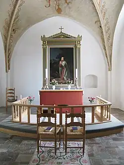 Die Kirche hatte einen spätgotischen Flügelaltar (um 1500–1520), dessen Mittelteil die Krönung Mariens zeigte, darüber ein Kruzifix mit Corpus, und die Seitenflügel waren mit zwölf Apostelfiguren ausgestattet wie z. B. Paulus mit einem Beutelbuch. Zu Beginn des 19. Jahrhunderts war der Altar so altersschwach und wurmstichig geworden, dass man ihn nicht mehr restaurieren konnte, doch ließ man ihn aus Pietät in der Kirche stehen, bis 1825 das obere Drittel des Mittelteils abbrach und zu Boden stürzte. Die meisten Figuren sind erhalten und werden seit 1851 im Nationalmuseum Kopenhagen aufbewahrt. Dort lagert auch eine Figur von Maria mit dem Kind, die von einem untergegangenen spätgotischen Seitenaltar aus Havnbjerg stammt.[5]