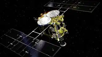 Die Sonde wurde 2014 gestartet; ihre Probenrückführungskapsel landete am 5. Dezember 2020 wieder auf der Erde. Die Sonde selbst fliegt weiter zu dem Asteroiden 1998 KY26, den sie im Jahr 2031 passieren soll. Hayabusa 2 ist die Nachfolgemission der erfolgreichen Raumsonde Hayabusa (Muses-C). Gebaut wurde Hayabusa 2, wie auch ihre Vorgängerin Hayabusa, von der japanischen NEC Corporation.[3] Dabei wollte man aus den Erfahrungen mit Hayabusa lernen, die trotz zahlreicher technischer Probleme nach dem Abschluss der Erkundungen des Asteroiden (25143) Itokawa erfolgreich zur Erde zurückgekehrt war.[4]