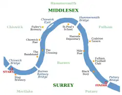 Die Mannschaften rudern nach dem Start eine Strecke von 6,8 Kilometern, das Ziel liegt etwas oberhalb der Putney Bridge im Stadtteil Putney. Auf der von zwei großen Kurven geprägten Strecke ist das Überholen der vorher gestarteten Mannschaften erlaubt. Die Siegerzeit liegt üblicherweise zwischen 17 und 18 Minuten, der Streckenrekord durch den britischen Nationalachter im Jahr 1987 beträgt 16:37 Minuten.[11] Die erreichbaren Streckenzeiten sind wie im Rudersport üblich stark von den Witterungsbedingungen abhängig.