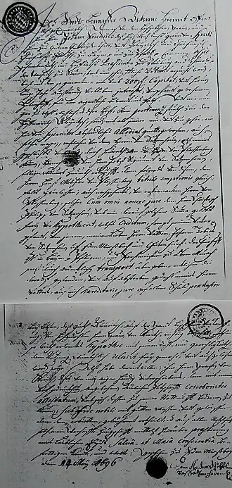 „ … , umb eine schriftliche Urkundt ersucht worden, / was mit dem so gegenanten mir Umb 300 fl: Capital, undt hievon / lange Jahre ausständig verblibene …, verpfändt gewesenen / Hebenhoff, für eine aigendliche bewandtnis habe. Undt mir nun / gar wohl wisslich, daß diser hoff kein pertinenz stukh zue der / hoffmarckh Gleyritsch, sondern mit all seiner ein: undt zue gehör, ein / hiervon Separirtes Absonderliches Allodial guett gewesen, auch / solcher massen, erstlichen von den herrn von Satzenhoven, alß meines / geschlechts verwandt, durch heurath an die herrn von Plassenberg komen, hernachaber, von herrn Jobst Sigmund von Satzenhoven / selbiges widerumb zuruckh erkauft, dann folgendes von disem den / herrn Hanß Melchior von Plassenberg titulo emptionis gleich / falls yberlassen, auch navhgehendts von ersternanten herrn von Plassenberg Cum omni annexo jure dem herrn Christoph Philipp von Satzenhoven umb eine darauf gelihene Suma geldts / frey ver hypothecirt, welches Creditum, sampt seinem Unter- / pfandt, von jenem meinem lieben herrn Vattern Johann Tobias / von Satzenhoven uf … Mießbach (heute Ödmiesbach, Gemeinde Teunz)[3] und Gutenfürst der Churfürstliche / dhl in Bayrn, Pfleger und Forstmeister zu Obern Murach … durch ordentlichn transport übergeben, entlichen die / darauf gestandene, und auf absterben gedacht meines herrn / Vatters, auf mich … jure gefallene Schuldpraetension / bey letzter, deß gueth Gleyritsch auf der Gandt beschehener Verkauff / ung, von hochgeachten herrn Graf von Kreith richtig bezahlt, mithin / so weit erwente hypothec … frey gemacht, undt auf gelöset / worden sey …
