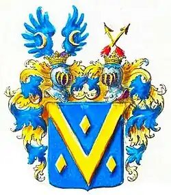 - In Blau ein goldener gestürzter Sparren begleitet von drei (1:2) goldenen Wecken. Zwei gekrönte Helme mit blau-goldenen Helmdecken: I. ein offener blauer Flug, rechts mit einem zunehmenden, links mit einem abnehmenden goldenen Halbmond belegt; II. zwei ins Andreaskreuz gestellte rot-gefiederte goldene Pfeile mit den Spitzen nach oben.
