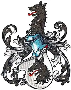 Blasonierung: In Silber ein schwarzer Wolfskopf mit rot ausgeschlagener Zunge. Auf dem Helm mit schwarz-silbernen Helmdecken der Wolfskopf.[1]