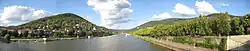 Die Abbaurelikte des Dossenheim-Vulkans am Sporenberg (von der Schauenburg aus), im Hintergrund die den Rheingraben begrenzenden Buntsandsteinberge bei Heidelberg