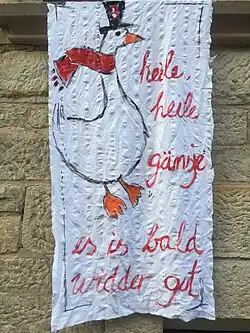 Mitte April riefen Fans des 1. FSV Mainz 05 im Zuge der COVID-19-Pandemie eine Solidaritätsaktion ins Leben, bei der sie drei wohltätige Organisationen finanziell unterstützen wollten. Im Rahmen der Aktion wurden T-Shirts, Jutebeutel und Aufkleber mit dem Spruch „Heile Heile Gänsje, es is bald widder gut“ und einer Gans produziert und verkauft. Die Erlöse sollten zu 100 % an Armut und Gesundheit in Deutschland e. V., Kochen für Helden Mainz und Ärzte ohne Grenzen fließen. Zudem wurde am 11. April 2020 an der Brüstung des Staatstheaters Mainz ein Banner mit der Aufschrift Heile Heile Gänsje, es ist bald widder gut angebracht, am 13. April 2020 folgten in der Stadt verteilt zahlreiche Plakate.[17] Die Fans wählten genau diesen Spruch, da die Liedzeile nahezu jedem Mainzer bekannt sei und diese den Einwohnern der Stadt Mut zusprechen solle. Da das Lied, die Fastnacht und der örtliche Fußballverein eng verknüpft seien, liege diese Adaption nahe.