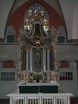 Der hölzerne Aufsatz des vor dem Ostfenster stehenden Altars stammt aus den Jahren 1770 bis 1775 und wurde vom Stralsunder Bildhauer Jakob Freese ausgeführt. In der Sakristei befindet sich ein Relief aus Alabaster. Das aus dem Jahr 1651 stammende Werk zeigt die betende Familie des Superintendenten Stappenbeck und stammt vom Epitaph desselben in der Jakobikirche. Die Empore über die gesamte Breite der Ostwand stammt von 1700. Zwei kleine Pforten führen von hier zur Galerie des Kirchgangs.