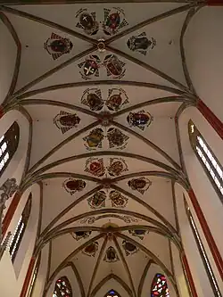 Die Kirche ist weiß ausgemalt, wobei die Rippen der einfachen Kreuzgewölbe farblich hervorgehoben sind. Die Rippen mit prismatischem Profil und zurückgesetztem Gesims sind in Bündeln zusammengefasst, die im Bereich des Kirchenschiffs meist auf Konsolen mit Masken oder floralen Motiven enden. An den Scheitelpunkten des Gewölbes sind die Rippen durch einen einfachen kreisförmigen Schlussstein verbunden, in dem sich eine thematische Malerei befindet. Über den Mittelschiffsarkaden befinden sich gemalte Darstellungen von Schutzheiligen. Die Seitenschiffe sind mit Kreuzrippengewölben geschlossen, die Rippen laufen in einen runden Schlussstein mit dem Buchstaben „G“ (wahrscheinlich das Monogramm des Königs Georg von Podiebrad) zusammen. Diese Darstellung des Buchstabens G wird auch auf den Wappen der Region Hradec Králové verwendet.[3]