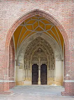 Die Sakristei mit einer als Selbstbildnis des Hans von Burghausen interpretierten Gewölbekonsole schließt an das sechste Joch des südlichen Seitenschiffes an. Der Turm mit rechteckigem Grundriss ist genau gegenüber an das nördliche Seitenschiff angebaut. Die Katharinenkapelle, die unmittelbar an das Turmerdgeschoss anschließt ist, ist folglich mit dem fünften Joch von Westen verbunden. Sie ist ferner mit einem aufwändigen achtstrahligen Sterngewölbe ausgestattet und besitzt Fenster mit kunstvollen Glasgemälden aus dem Jahr 1511 – entworfen vom Maler Sigmund Gleismüller und angefertigt von seinem Berufsgenossen Hans Wertinger. Außerdem enthält die Kapelle ein Wandfresko des Schmerzensmannes, umgeben zwei Engeln und diversen Leidenswerkzeugen.[3]