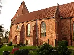 Der heutige Kirchenbau wurde in der ersten Hälfte des 14. Jahrhunderts nach einem Bauplan nach westfälischen Vorbildern als dreischiffige Hallenkirche aus Backstein errichtet. Dem fast quadratischen[1], dreijochigen, von neun Kreuzrippengewölben überfangenen Langhaus ist unter Verzicht auf ein Querhaus ein polygonal geschlossener Chor und ein gedrungener Westturm angeschlossen. Ihre Deckung des Mittelschiffs und der Seitenschiffe mit je einem Längsdach ist in Deutschland selten, in Flandern und den Niederlanden üblich. Beide Seitenschiffe haben konvex gekrümmte Außenwände. Ähnlich gekrümmte Außenwände haben mehrere Kirchen in Ostfriesland, am auffälligsten die romanogotische Eilsumer Kirche.