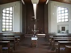 Die Altarwand im achteckigen Innenraum erhält Tageslicht von weit oben angeordneten Fenstern. Zusammen mit dem Licht des Deckenleuchters in der Mitte des Kirchenschiffes wird hiermit die österliche Herrlichkeit symbolisiert. Der Taufbrunnen, ebenfalls von Press gestaltet, hat einen direkten Anschluss an eine Wasserleitung.[1]